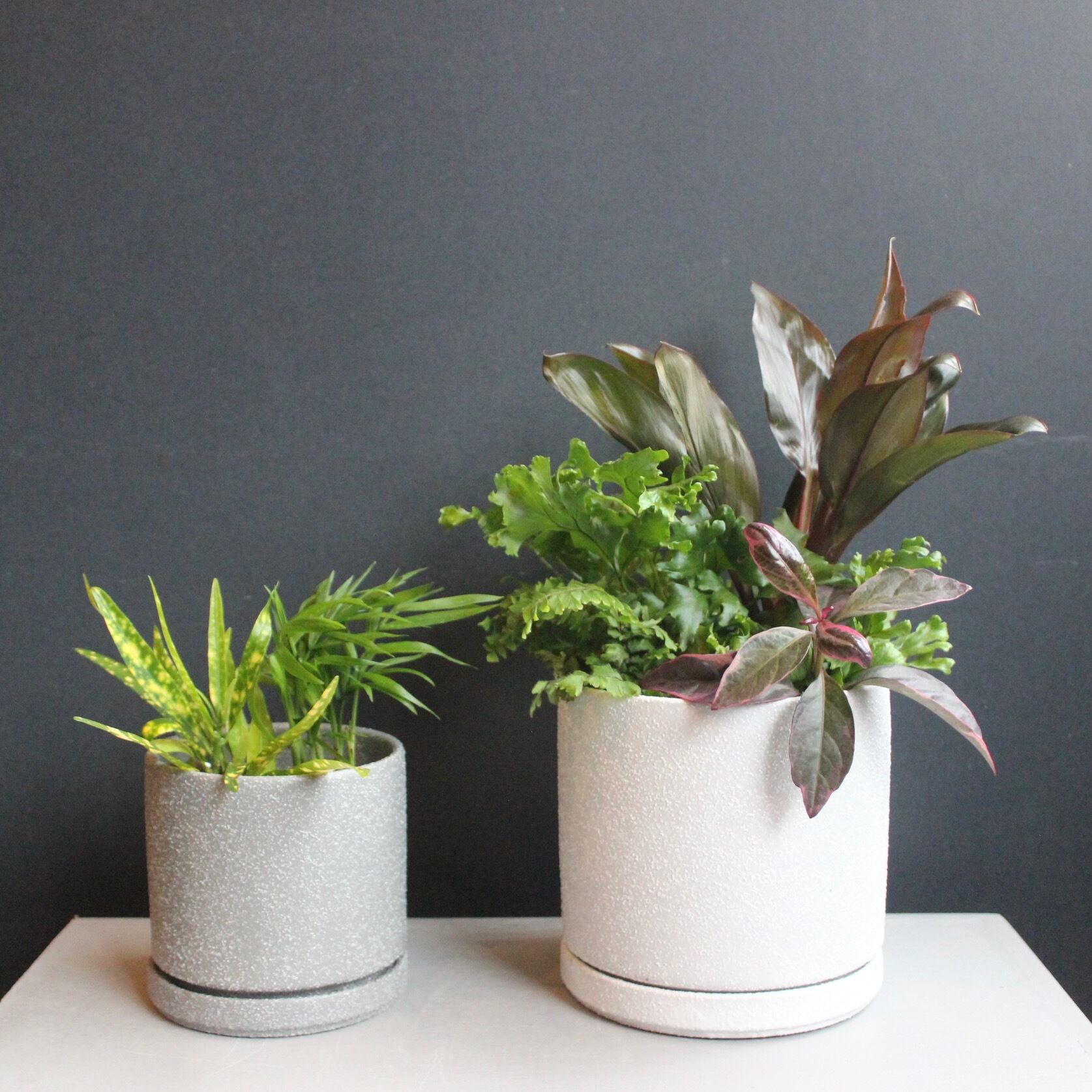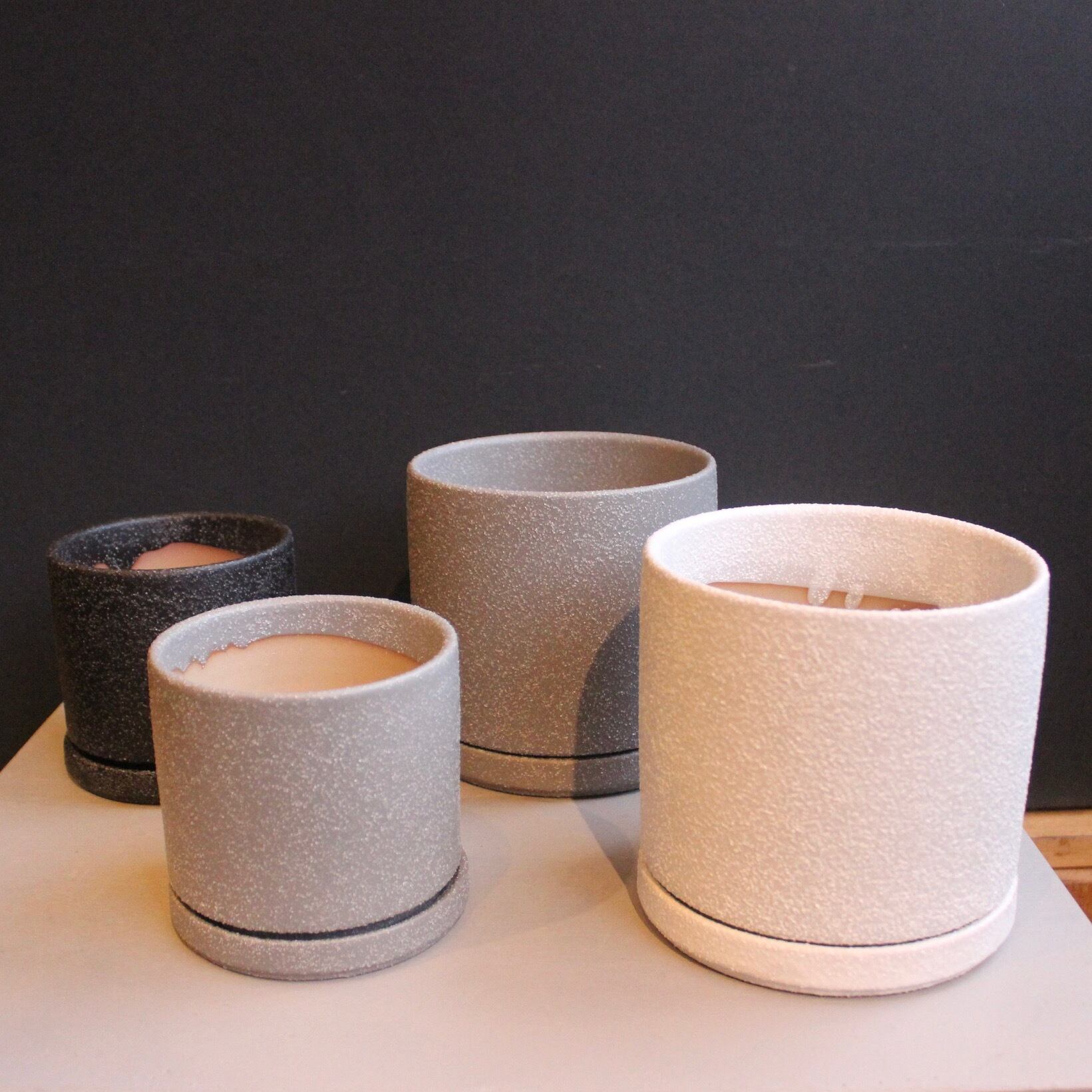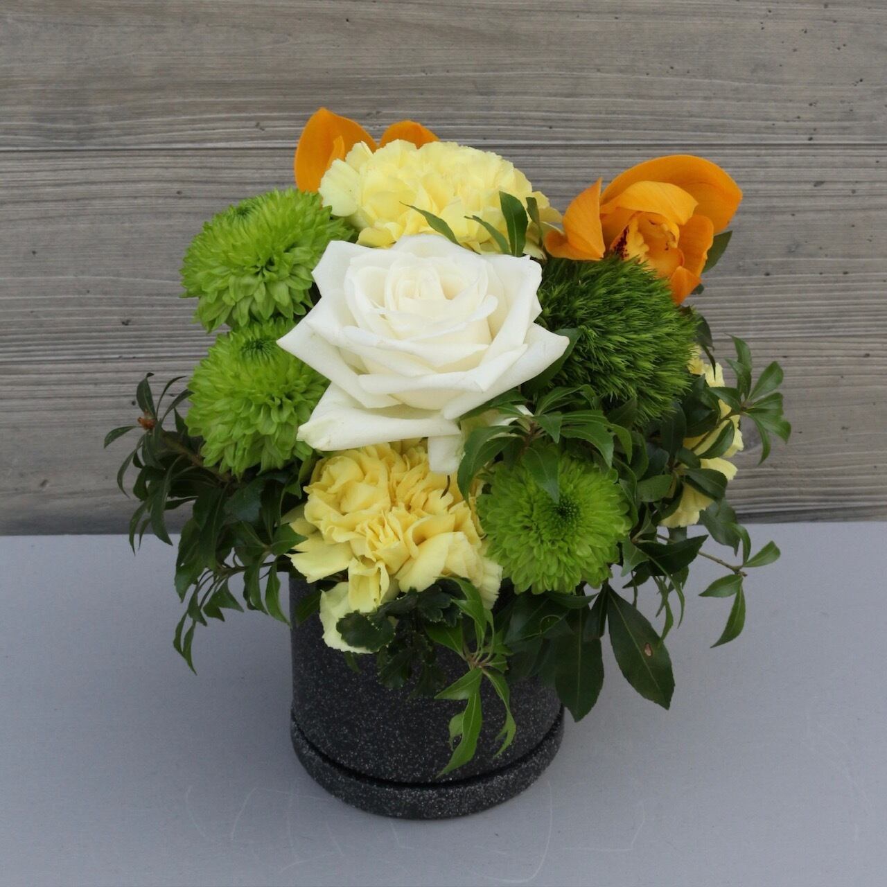 器はストーンライクなセラミックポットです。お花を楽しんだ後、植木鉢としてご活用いただけます。(受け皿付き)